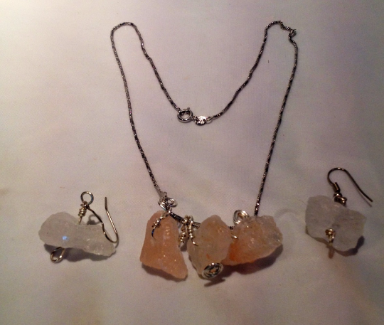 Himalayan Salt Crystal Pendants /earrings/necklaces are hand crafted, one-of-a kind, each one is wrapped unique to the stone, so no two are ever the same. These negative ion producing pendants are hand crafted in USA.